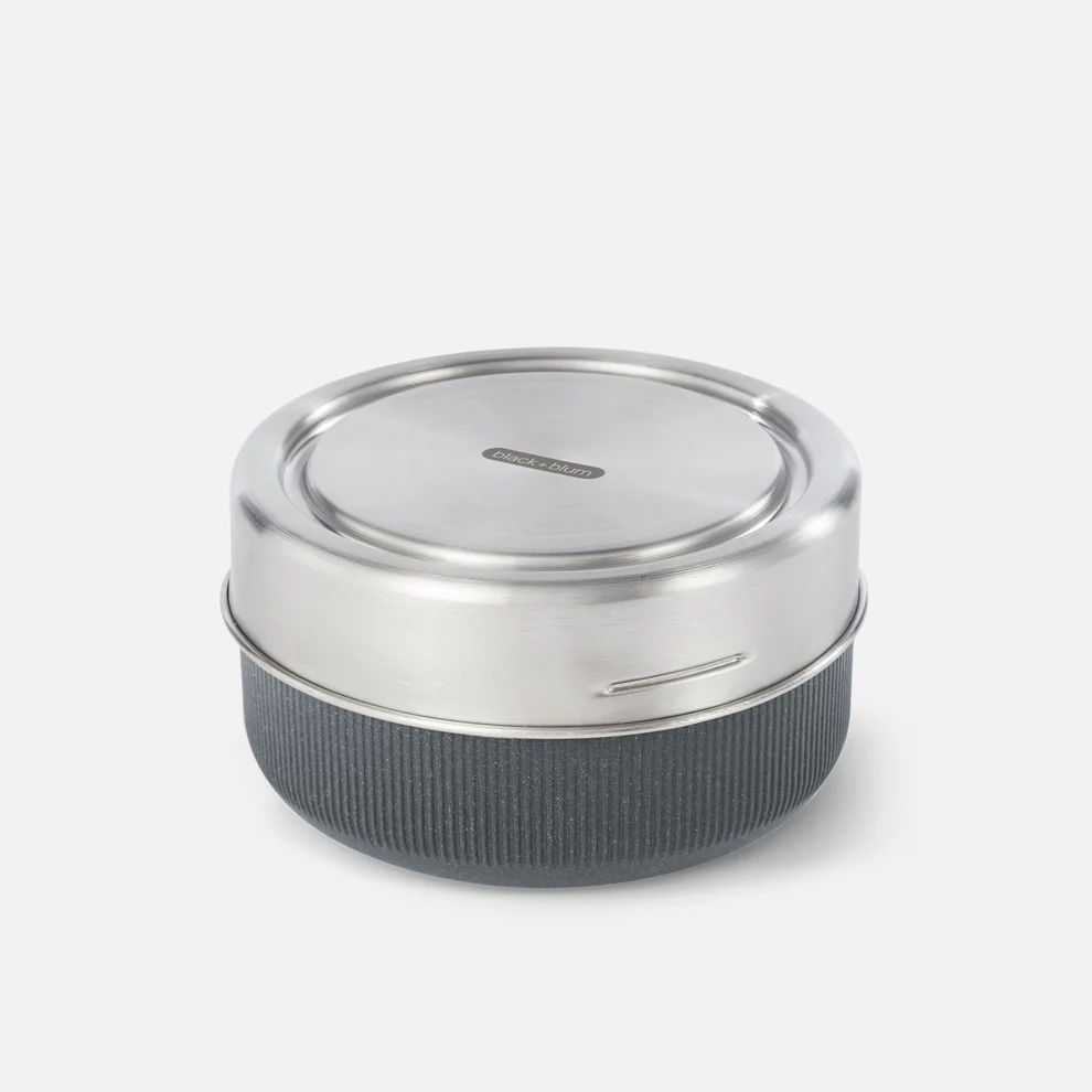 Una ciotola leggera in vetro borosilicato da 750 ml con un contenitore protettivo realizzato con una base in fibra di legno proveniente da fonti sostenibili e un coperchio in acciaio inossidabile.