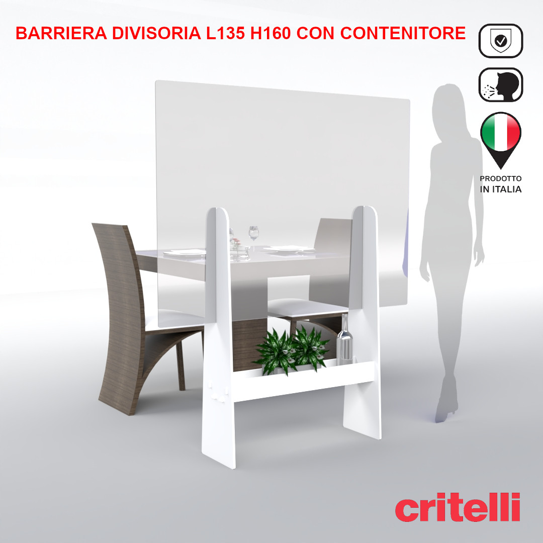 E’ una barriera divisoria con schermo infrangibile antiurto ed esclusivo vano contenitore che può aiutare nella rimodulazione della disposizione dei tavoli e delle scrivanie in sale aperte, offrendo una protezione tra i posti a sedere, per coadiuvare la protezione delle persone ad esempio durante il pasto (che necessariamente avviene senza mascherina), una particolare situazione ravvicinata interponendo uno schermo in grado di evitare la trasmissione diretta di droplets e per contatto tra persone.
