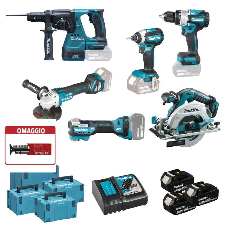 Combo Kit Makita DLX6126JX1 18V 5Ah, composto da: DHP486 trap.avv. c/perc+DHR243 tassell. sdsplus+DTD153 avv.impulsi+DHS680 sega circ.Ø165+DGA513 smerigl.ang. Ø125+DTM52 multifunzione