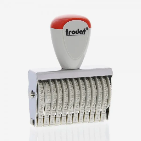La Linea Trodat Classic di timbri in gomma manuale. Il 15312 è un timbro numeratore con 12 colonne, ognuna di queste bande contiene le cifre da 0 a 9. La dimensione del carattere è di 3 mm. La serie di timbri della linea Classic è utilizzata con un tradizionale tampone per timbro.