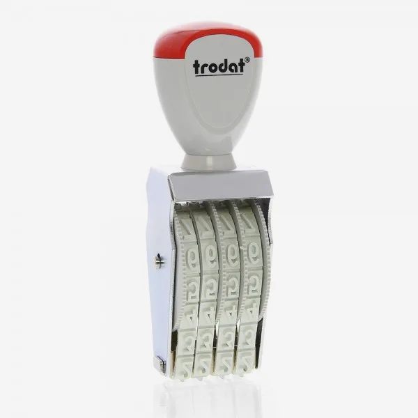 La Linea Trodat Classic di timbri in gomma manuale. Il 1574 è un timbro numeratore con 4 colonne, ognuna di queste bande contiene le cifre da 0 a 9. La dimensione del carattere è di 7 mm. La serie di timbri della linea Classic è utilizzata con un tradizionale tampone per timbro.