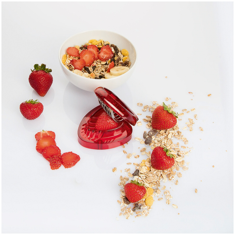 Un piccolo strumento che permette di affettare le fragole in fettine del medesimo spessore.