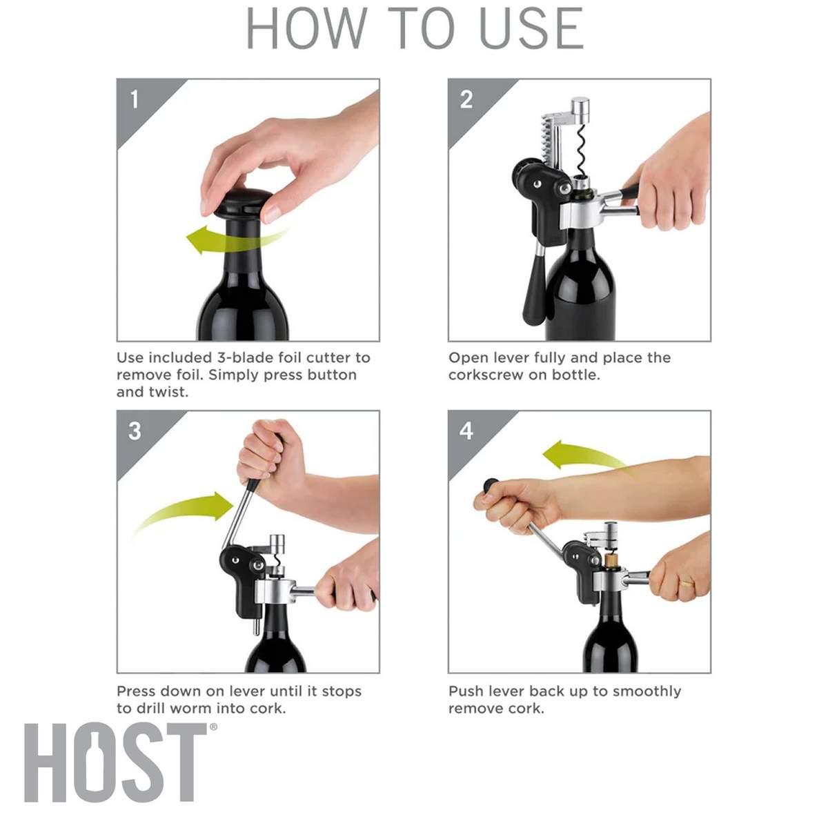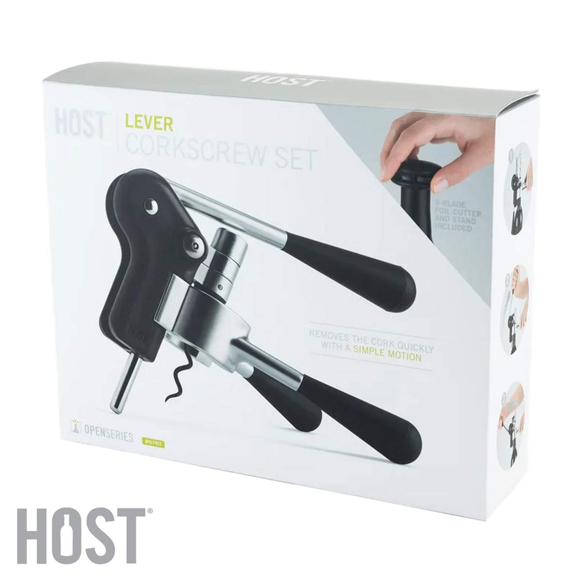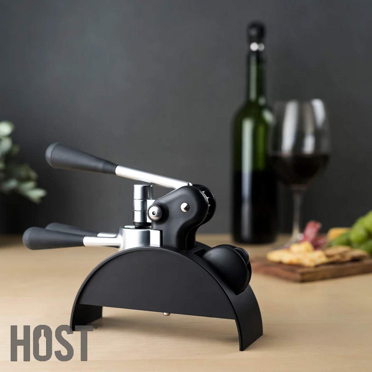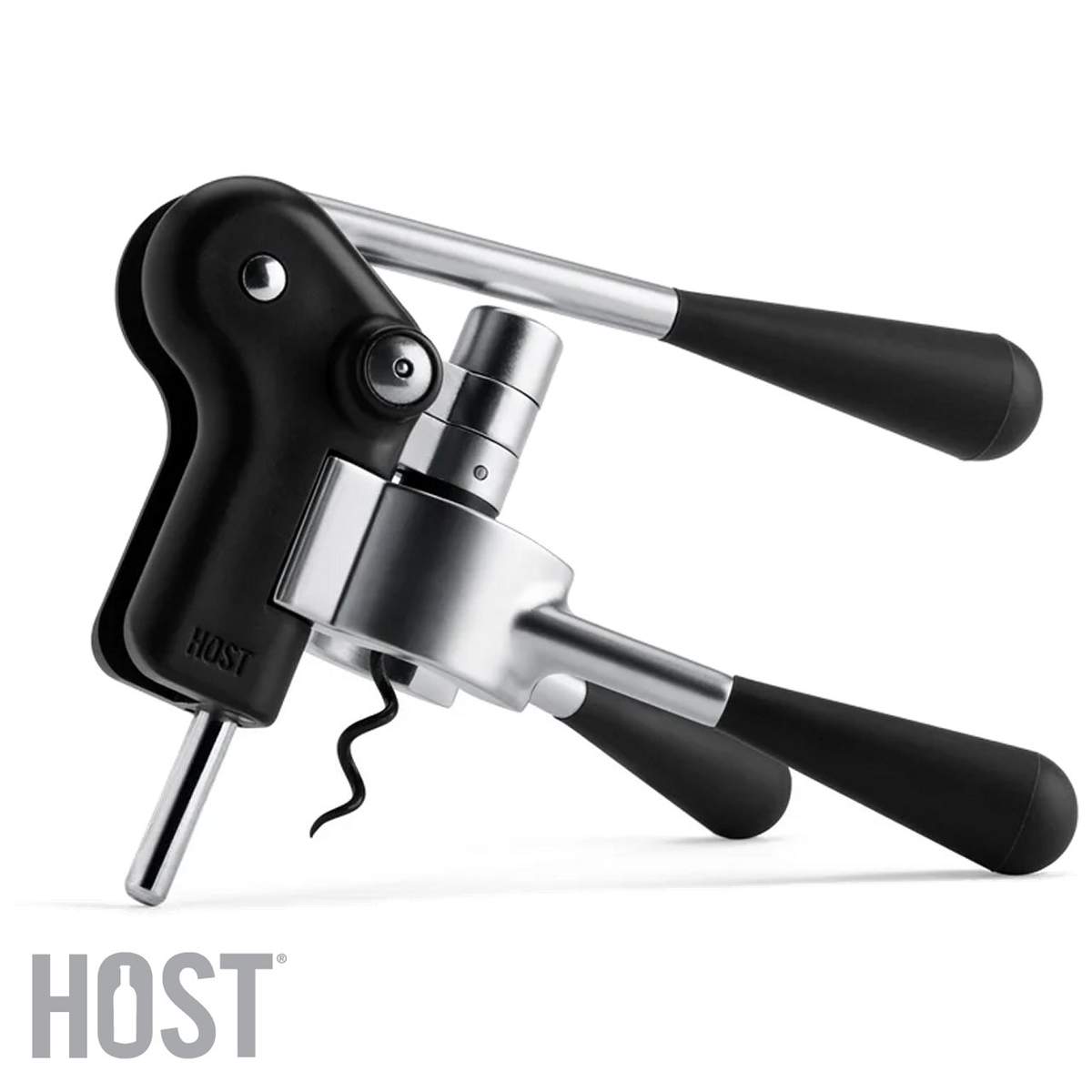 Cavatappi Host a leva elegante e raffinato, dotato di supporto, verme antiaderente e taglia capsule integrato, per aumentare di livello la tua esperienza di degustazione del vino.