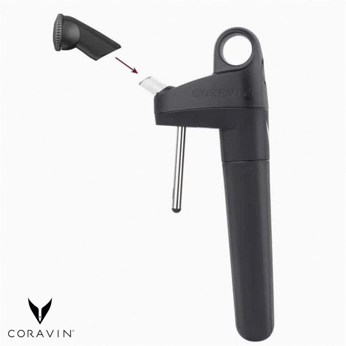 Utilizzare Coravin Pivot è facilissimo: per prima cosa è necessario aprire la bottiglia di vino e sostituire il tappo con uno Stopper in dotazione, poi si passa ad inserire il dispositivo Pivot attraverso lo Stopper fino a quando non scatta in posizione.